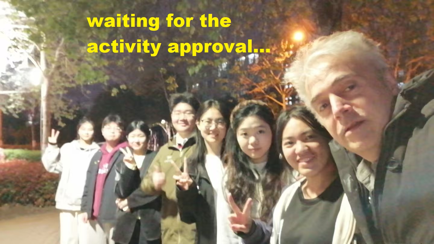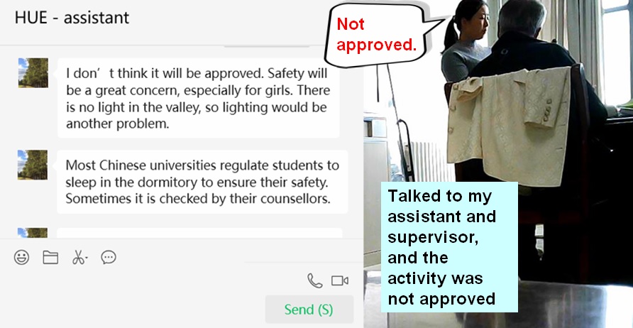I have talked to my assistant and supervisor, and I am sorry to say that this activity was not approved. I am sure those 7 students who where waiting below for the approval would be disappointed, and I supposed if we could do it such activity, we would never forget about it…