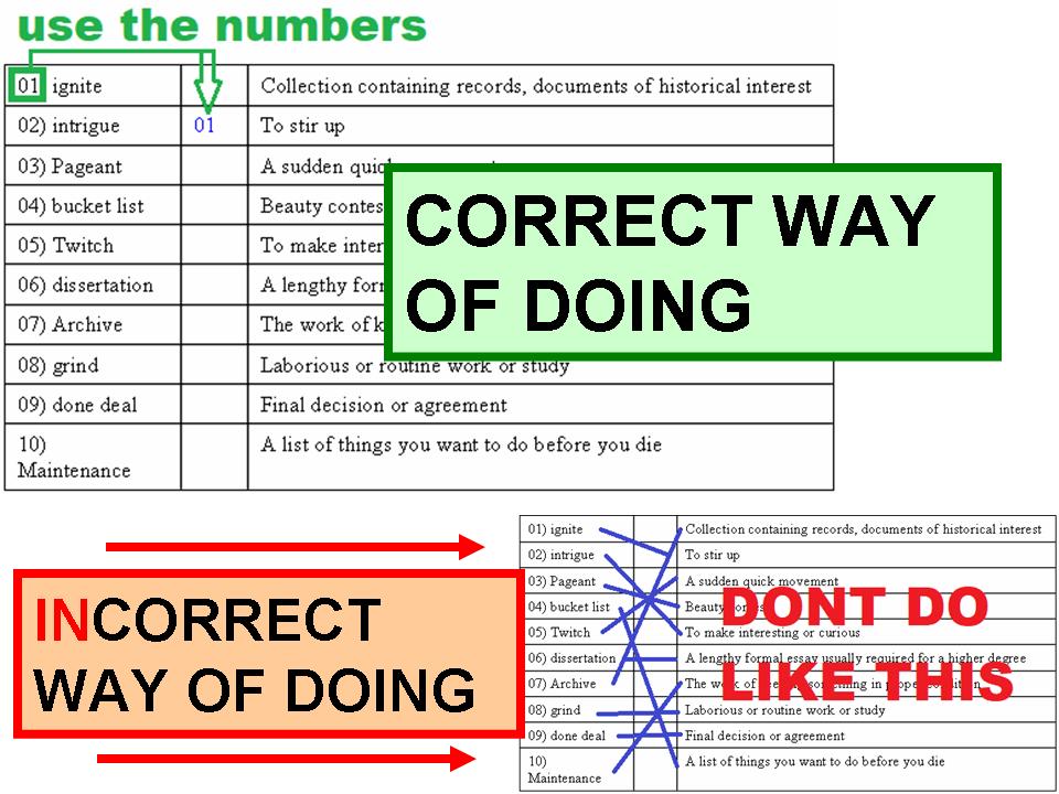 Vocabulary section – Use numbers to match the words and meanings. No lines, no spaghetti drawings on your paper, please.
